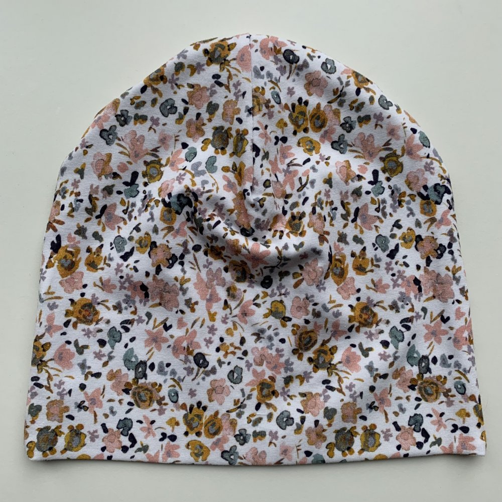 Hue i blødt bomuldsjersey. Huen kan bruges som en løs/"baggy" model eller med opsmøg - her sidder huen til hovedet.