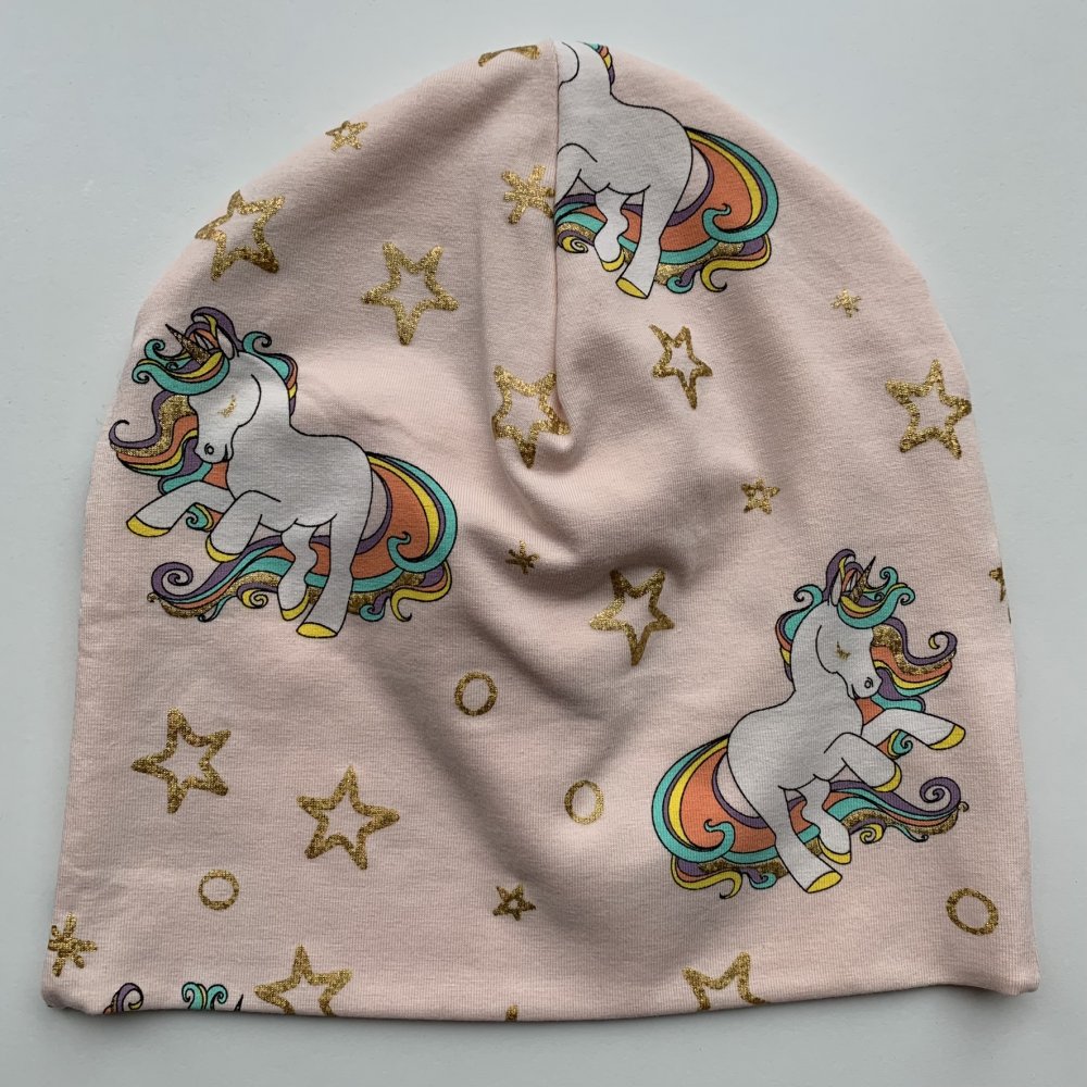Laksefarvet baggy hue med enhjørning - str. 5-10 år