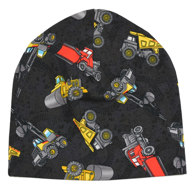 Dobbelt lag bomuldsjersey - 95 % bomuld og 5 % elasthan. Jerseystoffet er Øko-Tex 100 certificeret. Grå baggrund med store køretøjer.