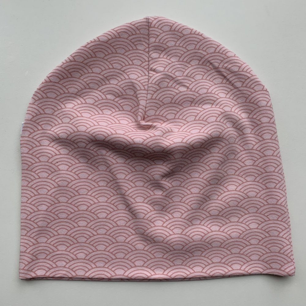 Hue i blødt bomuldsjersey. Huen kan bruges som en løs/"baggy" model eller med opsmøg - her sidder huen til hovedet.