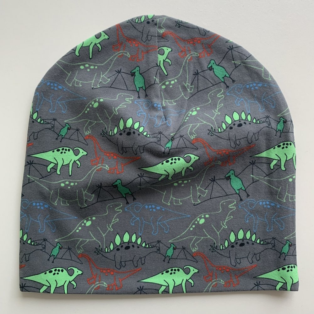 Grå baggy hue med dinosaurer - str. 2-4 år